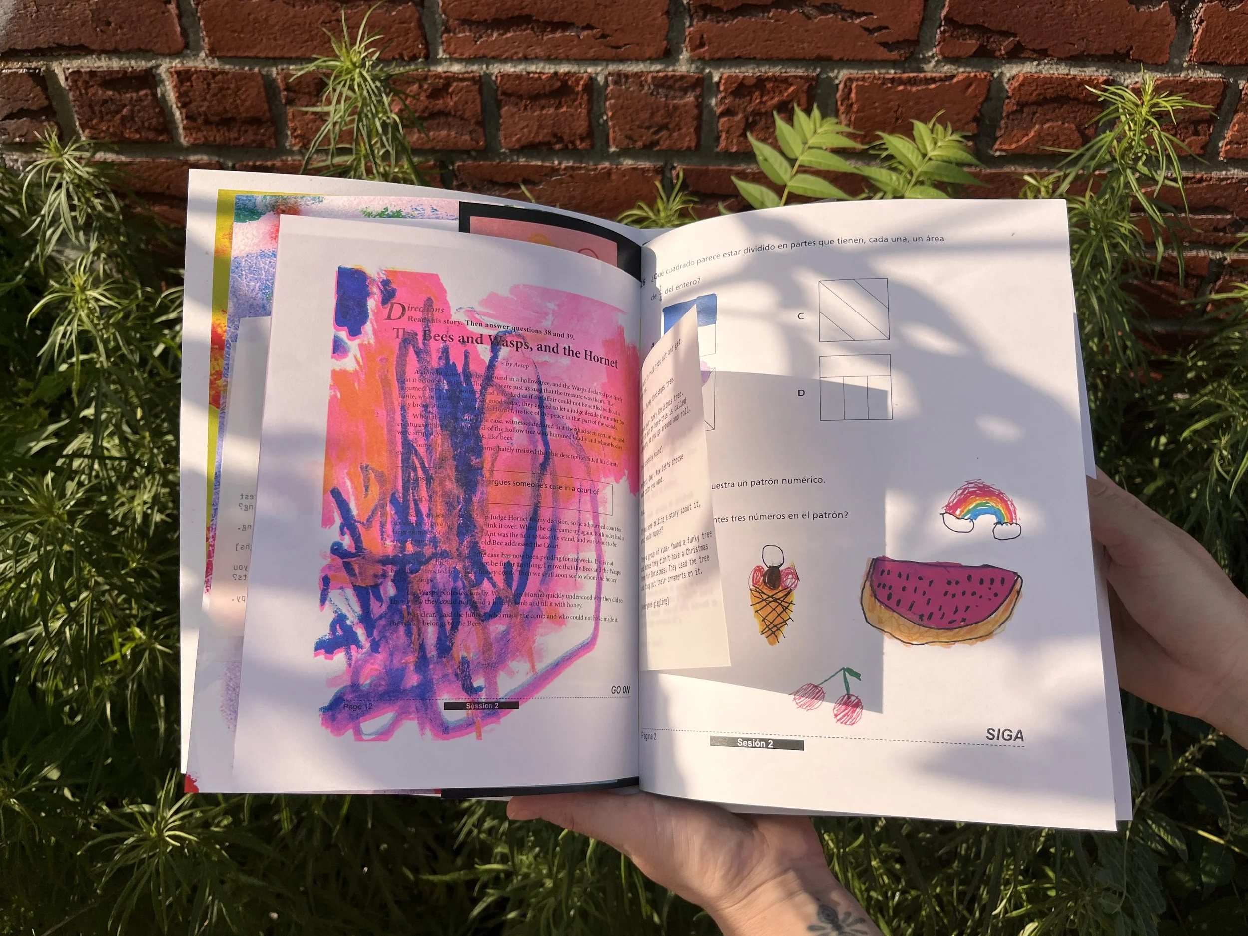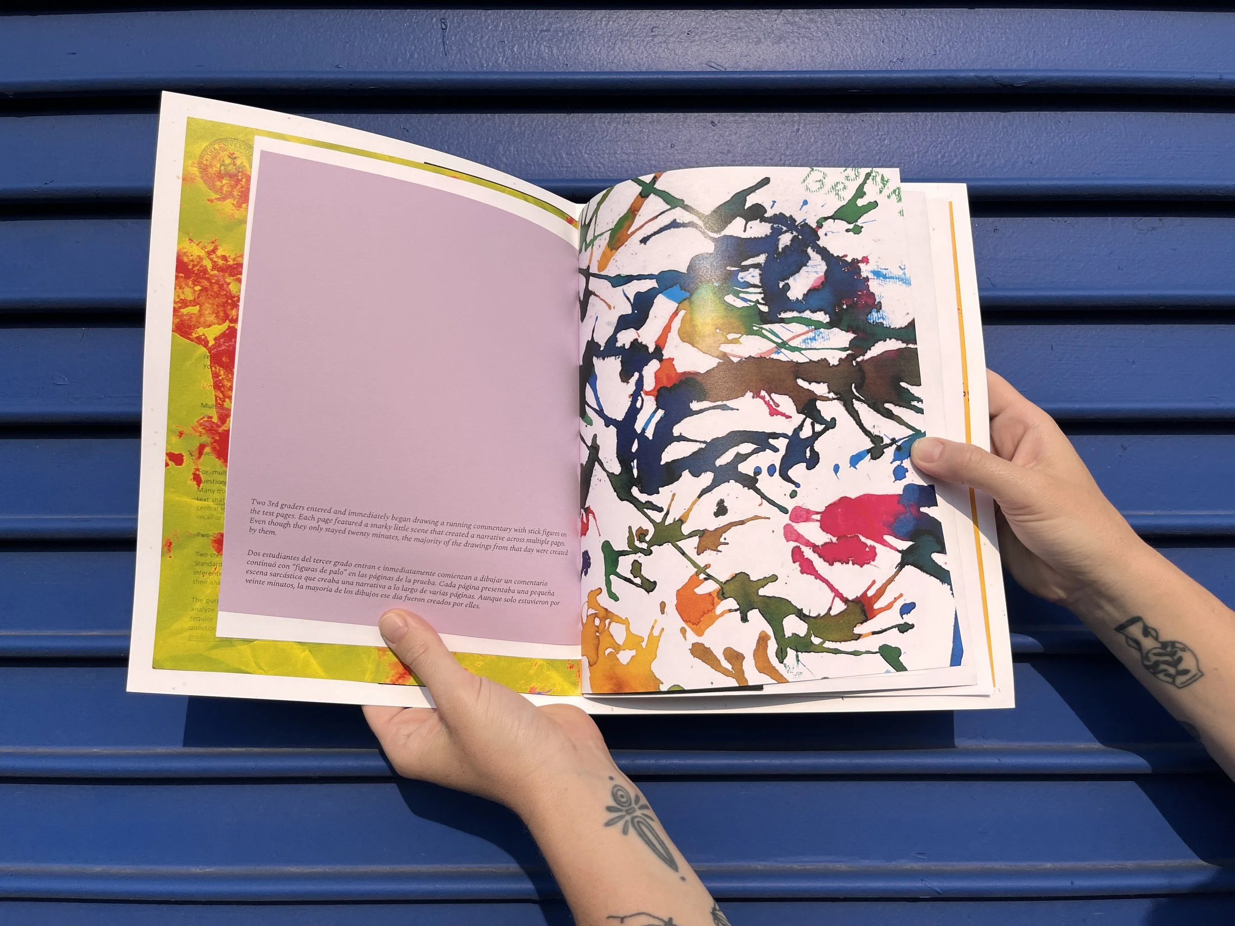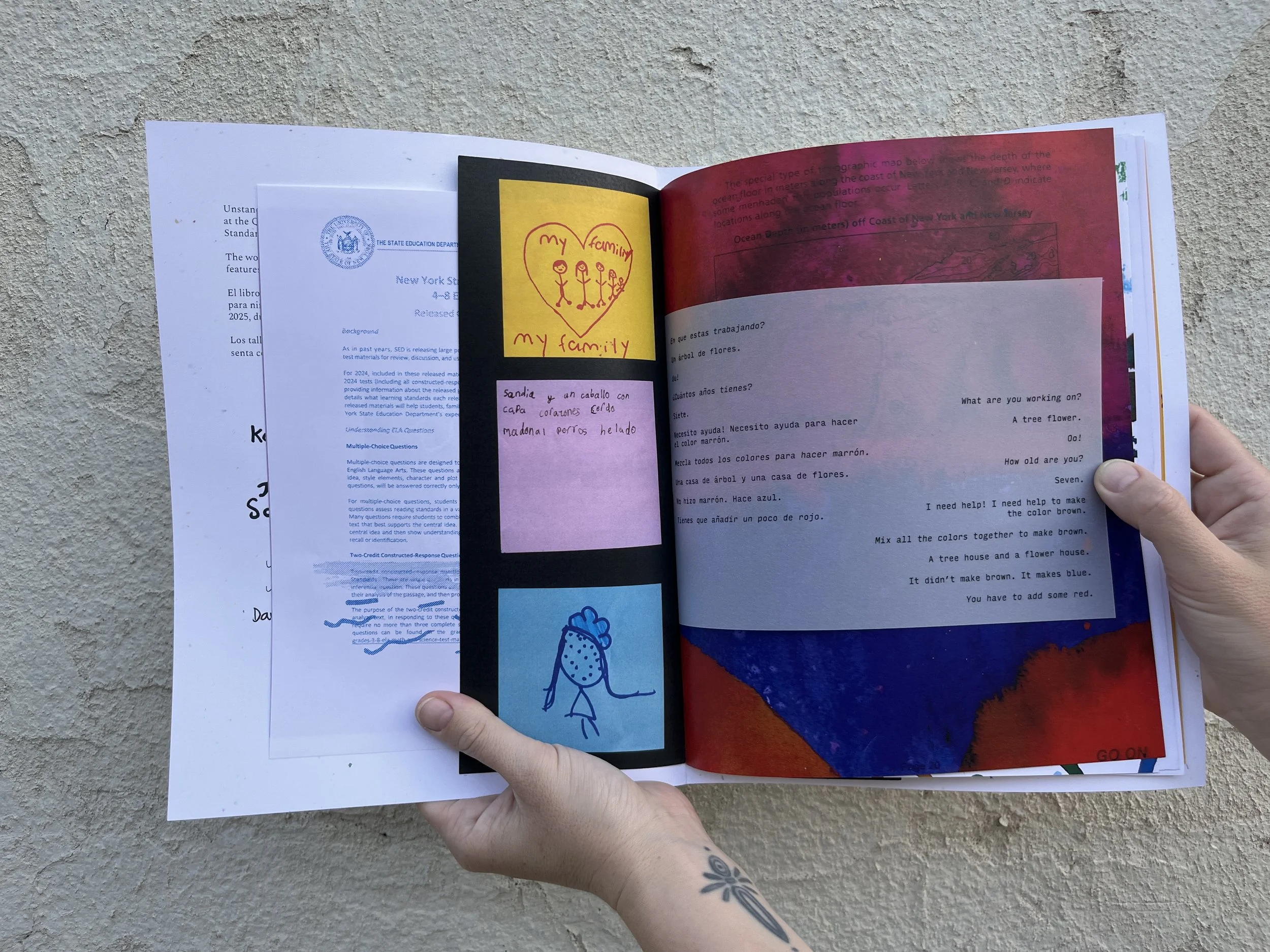 Unstandardized is a multiprocess artist book, printed using laser and risograph, exploring how children in Corona, Queens feel about State-mandated Standardized Testing. Unstandardized offers a window into a series of workshops through a process of layering of conversations in English and Spanish, testing pages, watercolor chaos, and texture.